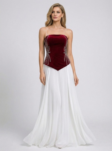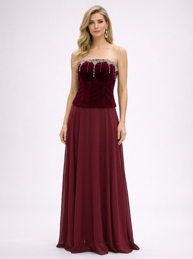 فستان سهرة مخملي بدون أكتاف بتطريز ناعم
